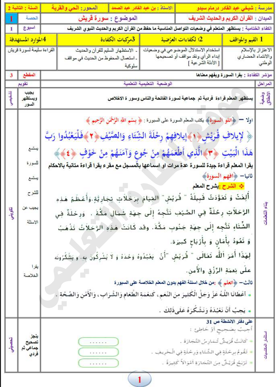 مذكرات درس سورة قريش لمادة التربية الاسلامية للسنة الثانية ابتدائي الجيل الثاني