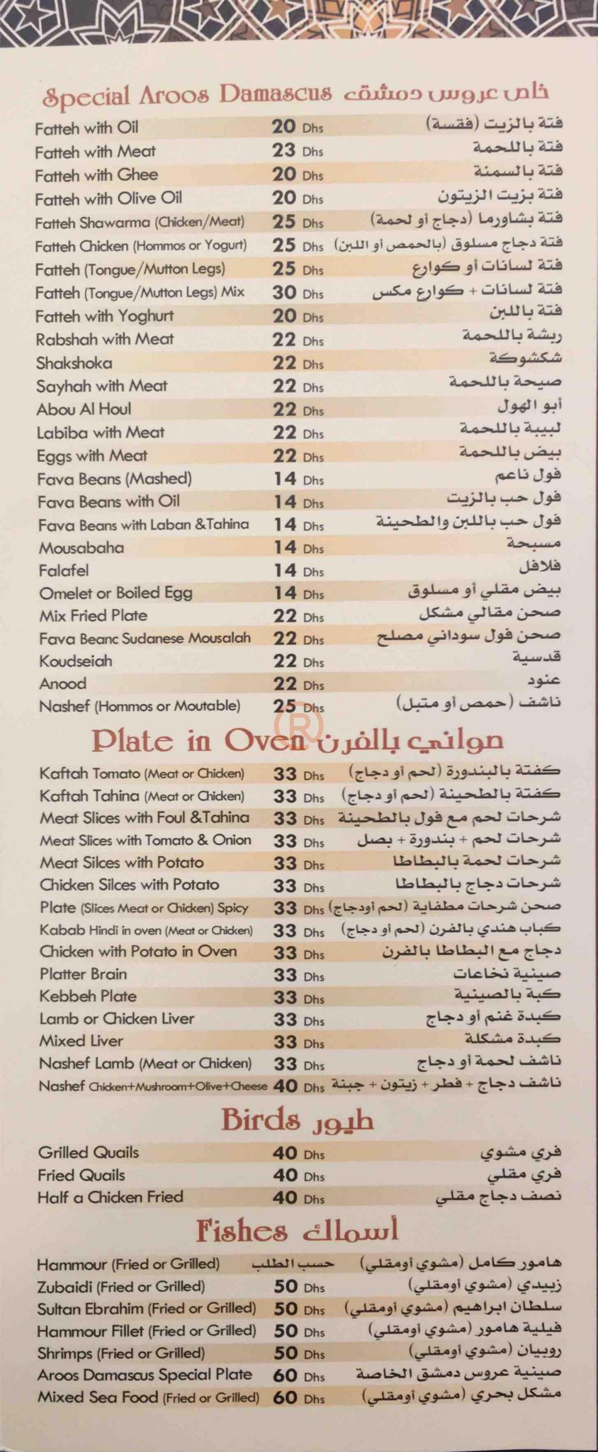 Aroos Damascus عروس دمشق Menu