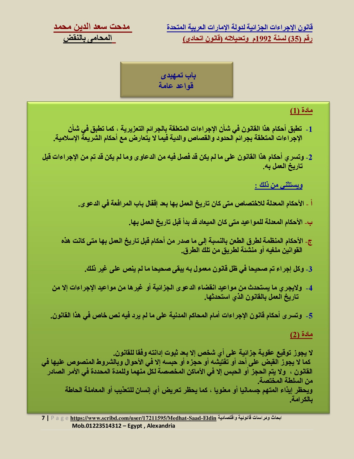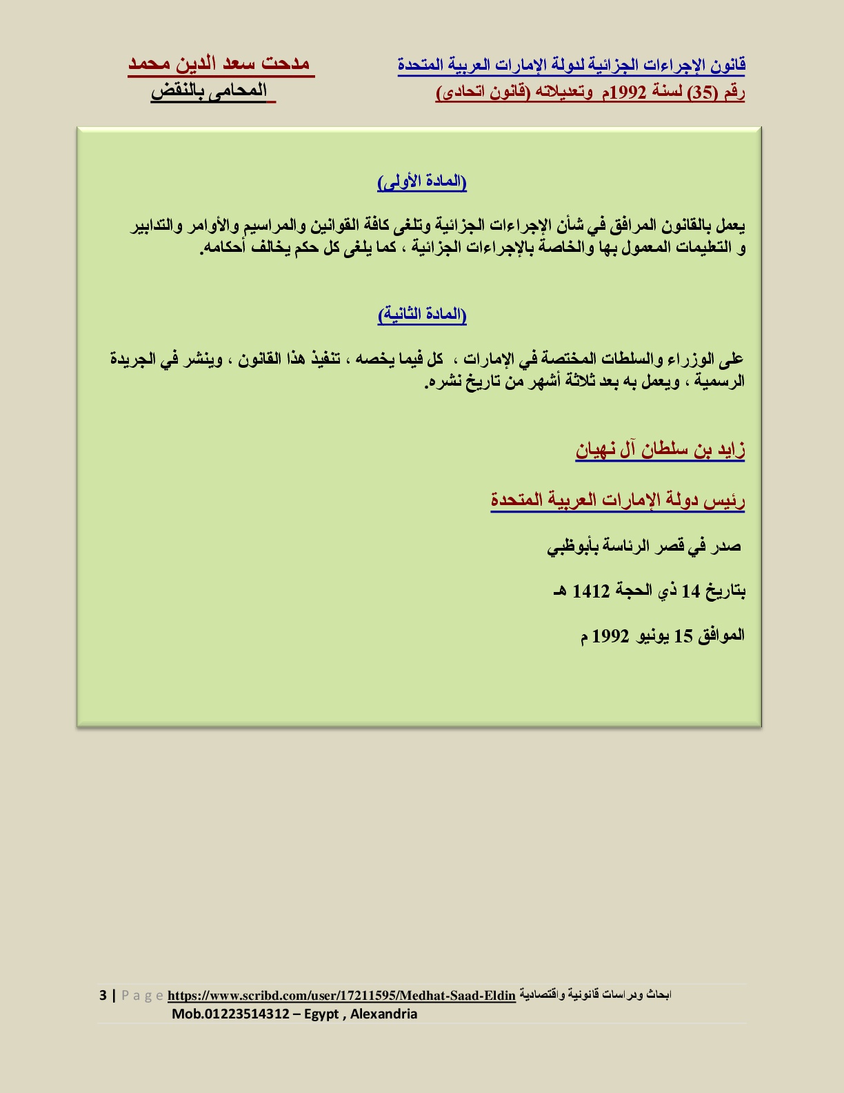 مدحت سعد الدين محمد المحامى بالنقض قانون الإجراءات الجزائية لدولة الإمارات العربية المتحدة رقم 35 لسنة1992 وتعديلاتة