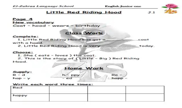 شيتات اسئلة وتمارين على قصة The Little Red Riding Hood او قصة ذات الرداء الاحمر