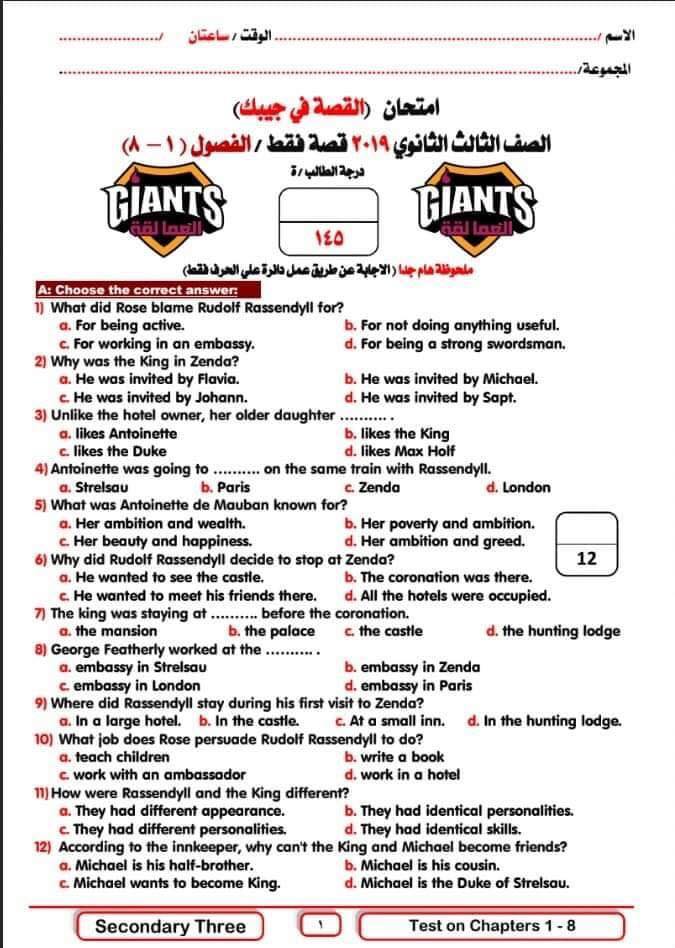 امتحان قصة The Prisoner Of Zenda للثالث الثانوى من العمالقة تضمن القصة فى جيبك سكول اون لاين مدرستى على النت