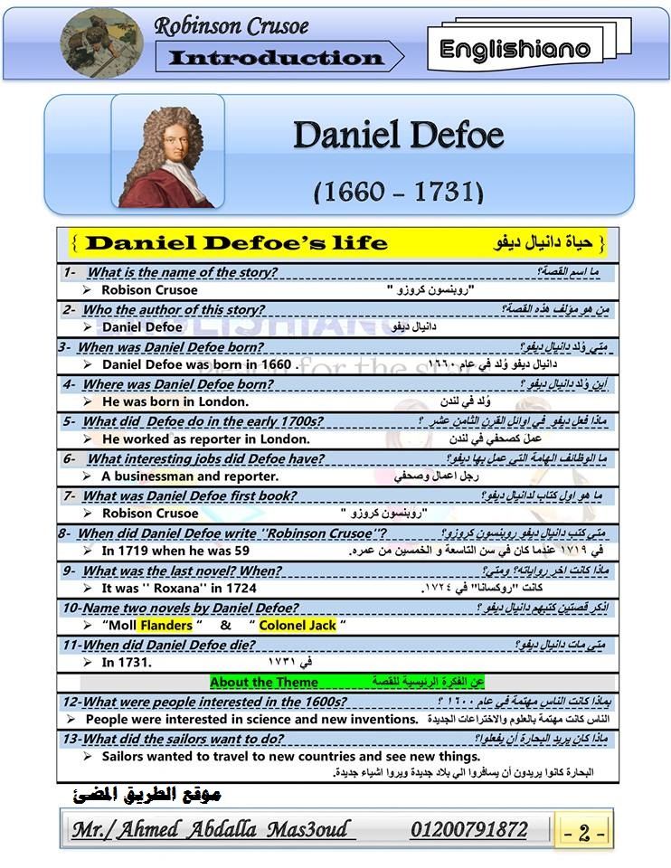 حمل مذكرة قصة روبنسن كروسو Robison Crusoe للصف الثاني الإعدادي الترم الاول 2020 لمستر أحمد مسعود