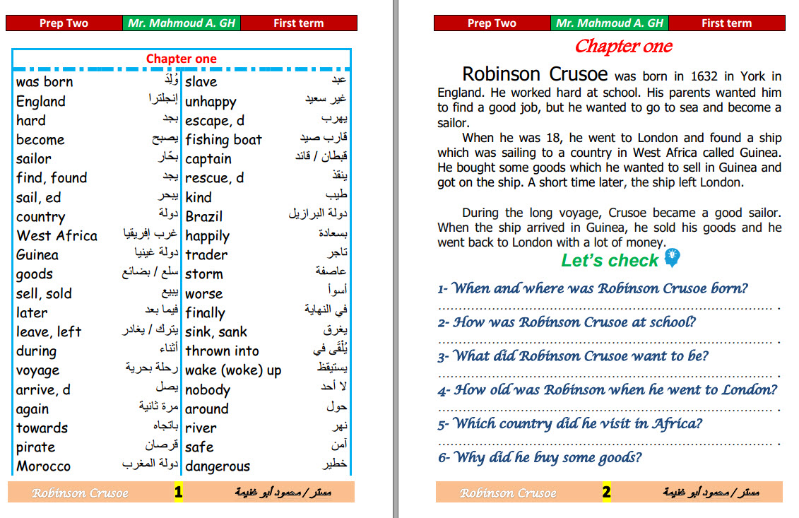 ملخص قصة Robinson Crusoe للثانى الاعدادى فى 4 ورقات فقط لمستر محمود بدر
